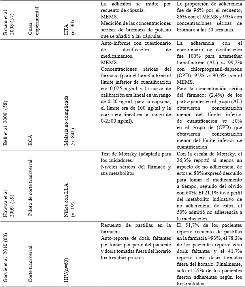 En cuanto a los métodos directos, se encontró que el 2,5% de los estudios evaluaron la adherencia terapéutica, a través de la concentración sanguínea del fármaco. Esto puede ser explicado por los altos costos, la complejidad y dificultad de aplicación de los mismos, lo cual no permite que estén al alcance de los escenarios de atención primaria (6,11), situación que requiere ser analizada a la hora de escoger el método más adecuado y válido acorde al contexto donde se pretenda medir la adherencia de las personas.