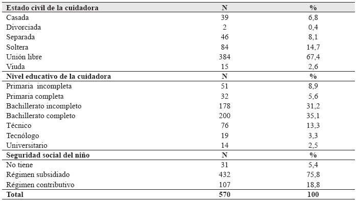 Participaron en el estudio 570 familias de 9 corregimientos de Cartagena; la información fue obtenida del cuidador principal. La edad promedio de los cuidadores de niños fue 29,6 años, (DE= 9,6 años) y la edad promedio de los niños es de 2,3 años (27,1 meses DE: 20,1 meses). En cuanto al estado civil de los padres, el 67,4% (384) conviven en unión libre; el nivel de escolaridad predominante fue bachillerato completo (35,1% (200)) y solo el 19,1% (109) tiene un nivel educativo que oscila entre técnico, tecnólogo y universitario. Con relación a la seguridad social, predominó la afiliación al régimen subsidiado (75% (432)), y no se encuentran afiliados a ningún régimen 5,4% (31) de los niños (ver cuadro 1).