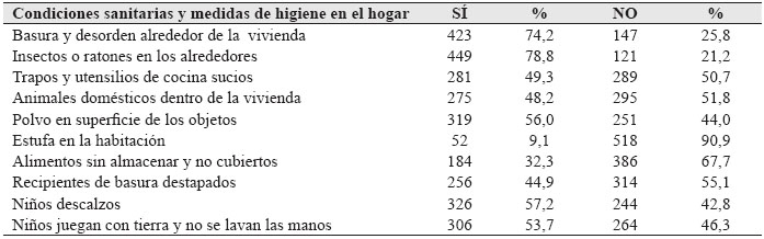 Del total de familias participantes, 74,2% (423) tiene presencia de basura dentro o fuera de su casa, el 44,9% (256) deja los recipientes de basuras destapados dentro del hogar. Con relación a las medidas de higiene, 57,2% (326) de los niños se encontraban descalzos, el 53,7% (306) juegan con tierra y no se lavan las manos. En general, 44,6% (254) de las viviendas se encuentran condiciones de desaseo (Cuadro 2).