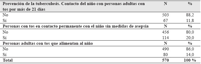 La última práctica clave de este grupo es la prevención de tuberculosis en los niños. La literatura indica que una de las variables que más se asocia a la presencia de la enfermedad en la infancia es el nexo epidemiológico, con un familiar o conviviente con tuberculosis. Lo que muestra que al estar expuesto al agente causal en la familia, aumenta la probabilidad que se presenten los casos, sobre todo en aquellas familias cuyas medidas preventivas no son adecuadas (32) . Es de notar que este estudio revela un porcentaje de niños que viven en el área rural de la ciudad están en contacto permanente con personas que han presentado tos por más de 14 días y que no tienen medidas de higiene y protección adecuadas para impedir la proliferación de microorganismos dentro de la vivienda. El nivel educativo y el acceso a servicios de salud del régimen contributivo son variables que favorecen la aplicación de esta práctica. En tanto se espera que durante las consultas de salud, se brinde orientación de calidad sobre las medidas preventivas en los niños y que aquellos padres con un mejor nivel de escolaridad sean más competentes para asimilar la información que reciben y ponerla en práctica; todo esto, se convierte en una herramienta valiosa para ayudar a la reducción de la incidencia de esta enfermedad en las poblaciones de niños más vulnerables (33).