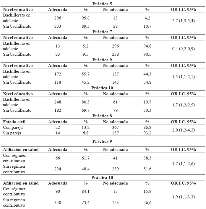 La edad del cuidado no se asocia de forma significativa a la aplicación adecuada de las prácticas para la prevención de enfermedades. Se observa que un mayor nivel de escolaridad, influye de forma positiva en la aplicación de las prácticas 5, (OR=2,7 (IC 95% 1,3-5,4)), 7 (OR=0,4 (IC 95% 0,2-0,9)), 9 (OR=1,5 (IC 95% 1,1-2,1)) y 10 (OR=1,7 (IC 95% 1,2-2,5)). Tener pareja aumenta la probabilidad de aplicación de la práctica 8 (OR=2,0 (IC 95 % 1,2-4,2)) y la afiliación en salud a un régimen contributivo favorece la aplicación de las prácticas 9 (OR=1,7 (IC 95% 1,1-2,6)) y 10 (OR=1,9 (IC 95% 1,1-3,3)) (Cuadro 4).