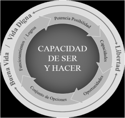 Para hacer el análisis de la salud y el desarrollo humano en el Programa FAMI se tomó como punto de partida teórico la propuesta de salud como metacapacidad de Venkatapuram 15. Dicha teoría se sustenta en el enfoque teórico de desarrollo humano propuesto por Martha Nussbaum. Este enfoque reconoce el desarrollo como un proceso de expansión de las capacidades y las oportunidades de las que las personas pueden disfrutar para tener una buena vida o una vida digna 16. Centra su atención en la potencia o posibilidad de los sujetos para desarrollarse y en el conjunto de opciones que se les presentan para que estos puedan aumentar sus oportunidades para alcanzar distintos logros en el transcurso de su existencia. A continuación, se ilustra esta concepción del desarrollo humano