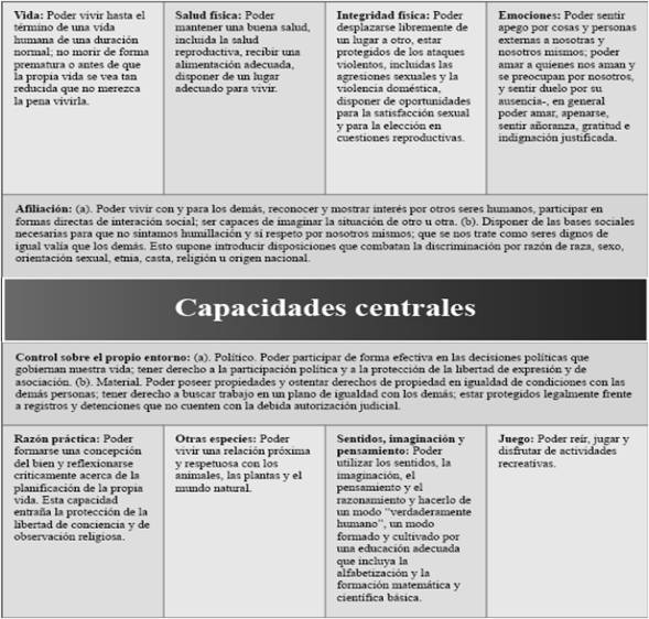 Esto constituye una metacapacidad en el sentido de que la salud como vida digna requiere el logro de un nivel mínimo de cada una de las diez capacidades definidas por Nussbaum que son sinérgicas 18.