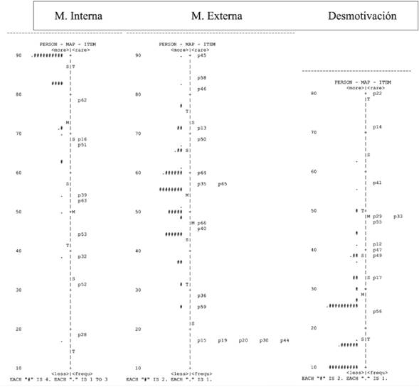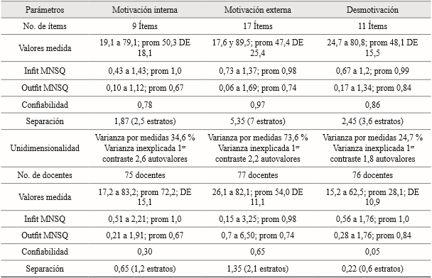 Para el análisis mediante el modelo de Rasch se estudiaron por separado los tres componentes de la motivación (interna, externa y desmotivación) dado que una de las características de este modelo es la unidimensionalidad de la variable latente bajo estudio. Una vez realizado el proceso de depuración inicial, para excluir ítems y personas que no se ajustaron a los parámetros Rasch, se procedió al análisis de los componentes de la motivación; los resultados para ítems y docentes se observan en la tabla 1.