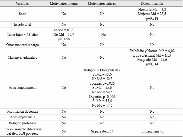 Solo hubo resultados con significancia estadística para 3 variables: sexo, nivel educativo y materias o asignaturas que conducían las/los profesores. Las mujeres fueron más afectadas por la desmotivación; la motivación externa fue influida por las cátedras de Religión y Ética, Sociales y Deportes; el FDI por sexo influyó en ítem 57 de motivación externa y en 43 de desmotivación, los cuales fueron excluidos previo a los análisis Rasch. Vale la pena señalar que el tener hijos menores de 18 años estuvo muy cerca de ser estadísticamente significativo (p=0,058) para la motivación interna de las personas docentes.