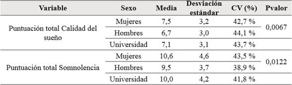De acuerdo con la tabla 1, los estudiantes hombres presentan menor media en calidad del sueño y somnolencia (Pvalores de 0,0067 y 0,0122). En la primera variable la media de los estudiantes, sin discriminar por sexo, fue de 7,1; hallazgo que indica una calidad del sueño que merece atención médica. Asimismo, en cuanto a la somnolencia diurna, se evidenció una puntuación promedio de 10 puntos que permite señalar un rango de “severidad moderada” 36. Adicionalmente se muestra una alta dispersión en los puntajes de calidad de sueño y somnolencia (coeficientes de variación alrededor del 40 %), indicando valores heterogéneos en estas variables.