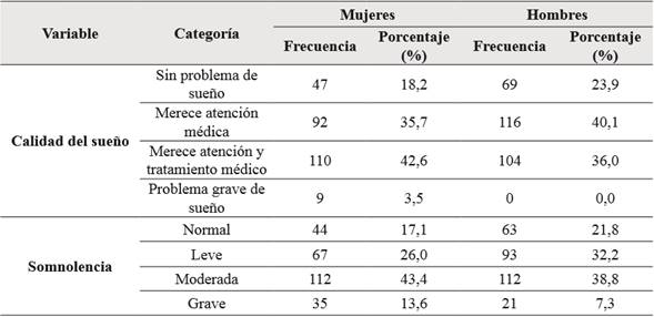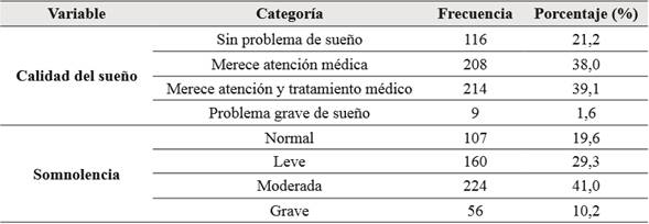 Resultados: Se trabajó con 258 mujeres (47,2 %) y con 289 hombres (52,8 %) cuyas edades medias y desviaciones estándar fueron de 22,9 años y 3,8 años para los hombres y de 20,9 años y 2,7 años para el caso de las mujeres. Se encontró que, en general, los estudiantes tienden a tener una calidad de sueño que merece atención y tratamiento médico (77,1 %). Asimismo, que el 70,3 % presenta somnolencia leve o moderada.