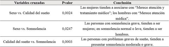 Al realizar pruebas de independencia entre las variables sexo, calidad de sueño y somnolencia se encontró lo reportado en la tabla 4.