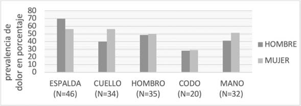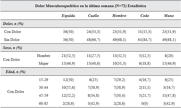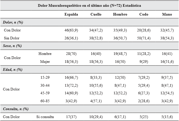 Los datos obtenidos del estudio muestran que el 81,9% de la población manifiesta dolor musculoesquelético en alguna parte del cuerpo. Se encontró que en el último año existe una alta prevalencia principalmente en espalda baja (63,9%). Asimismo, aproximadamente la mitad de la población manifiesta tener dolor en cuello (47,2%), hombro (49,3%) y manos (45,7%). Sin embargo, de aquella población que manifiesta dolor, la consulta a médicos o sanitarios de salud es baja y la mayoría son por problemas de dolor de espalda, solo el 15,6% de las consultas están relacionadas con dolor en las manos (ver tabla 2).