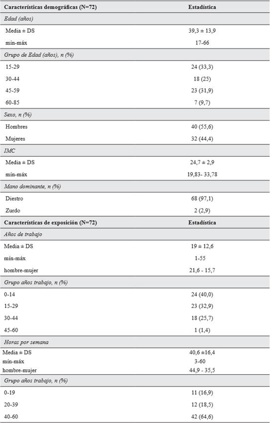 La muestra correspondió a una población de 72 agricultores; en un mayor porcentaje hombres, con una edad promedio de 39,3 años y un IMC normal de 24,7 Kg/m2. La tabla 1 describe las características demográficas y de exposición al riesgo de los participantes; la mayor parte de la población ha trabajado más de 30 años con un promedio de 40,6 horas por semana en las actividades del cultivo de Mora de Castilla.
