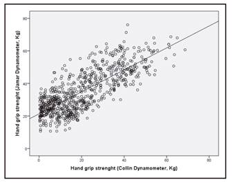 We found good correlations between grip strength measured with both dynamometers. Although the Collin dynamometer is significantly more economical, we believe its use may be less suitable than that of the Jamar dynamometer because some people (especially older women) have some difficulty in correctly grasping the device and applying force, so the measurement may not be valid. This may be of special relevance in the hospital setting, where the mean inpatients age is high.