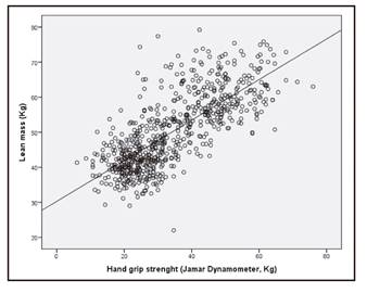 There are numerous clinical studies in hospitalized individuals or outpatients (surgical, elderly, oncological, etc.) that demonstrate that decreased grip strength, measured by hand dynamometry, is associated with increased stays, mortality and complications 3) (7) (8. Similarly, in epidemiological studies performed in different age groups, decreased grip strength is also associated with higher mortality and impaired functionality 3. Some body composition measures, like lean mass, seem to have a close relationship with hand strength as well as with physical function 9.