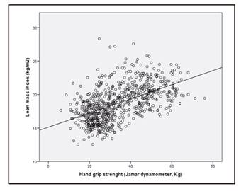 The values obtained using the Jamar dynamometer showed a positive correlation with weight (r = 0.514; p < 0.001), height (r = 0.714; p < 0.001), and arm circumference (r = 0.249; p < 0.001), and a negative correlation with fat mass in kg: (r = -0.597; p < 0.001), triceps skinfold (r = -0.497; p < 0.001), biceps skinfold (r = -0.404; p < 0.001) and subscapular skinfold (r = -0.209; p < 0.001). There was also a significantly positive correlation between muscle strength and lean mass in kg (r = 0.774; p < 0.001) and lean mass index (LMI) (r = 0.538; p < 0.001) (Fig. 2 and Fig. 3).