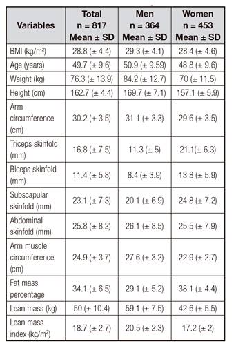A total of 817 adults, 364 men and 453 women, were studied (Table I).