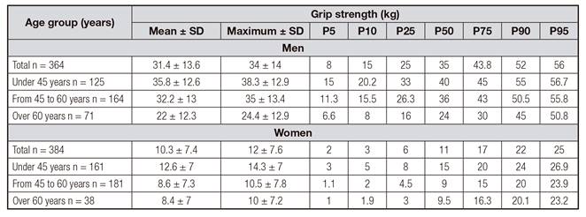 Similar to other studies 4) (20) (27, our values were significantly higher in men than in women for all age groups and negative correlations with age were observed, finding a decrease in grip strength (4). This has been attributed to age-related sarcopenia, since the weight loss that occurs with aging is primarily due to the loss of lean mass, thus leading to loss of grip strength 17. In our sample, no significant differences between the groups of individuals under 45 years and between 45 and 60 years were found, possibly because age-related sarcopenia appears especially in subjects aged 60 and older 4.