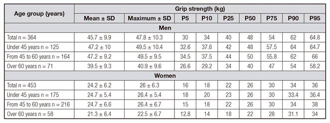 Material and methods: This cross-sectional population-based study was undertaken in Pizarra (Málaga, Spain). The grip strength of the dominant hand was measured using Collin and Jamar dynamometers. Skinfolds (triceps, abdominal, biceps of dominant arm and subscapular) were measured, and body composition was estimated. Eight hundred seventeen adults randomly selected from the census were recruited. Dynamometry reference values are presented for the dominant hand, by gender and age groups.