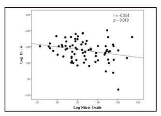 Interestingly, there was a positive correlation of NO with the SOD enzyme (r = 0.616 p < 0.001), and negative correlation with total protein (r = -0.214 p = 0.049), as shown in Fig 1. No significant correlations were found among others markers such as MDA and GST, or TAC when related to NO. Furthermore, NO concentrations were negatively correlated with IL-6 and IL-10 concentrations, pro- and anti-inflammatory markers, respectively (Fig. 2).