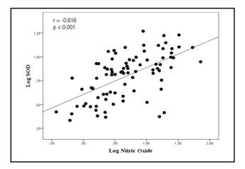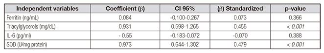 Finally, in the multiple regression model, the concentrations of ferritin, triacylglycerols, IL-6 and SOD contributed with a 54.8% of variation in NO concentrations, whereas triacylglycerols and SOD concentrations were independent predictors (Table V).
