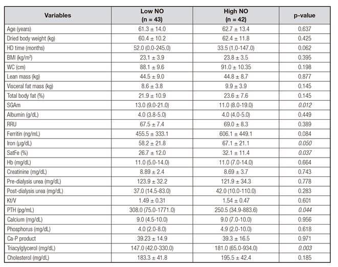 The majority of the participants were men (65.9%; n = 56) and elderly (61.2%, n = 52). The main causes of CKD in the study population were hypertensive nephrosclerosis (41.2%; n = 35) and diabetes mellitus (32.9%; n = 28). The HD time ranged from 1 to 245 months, with a median of 41.5 months, presenting a statistical tendency when associated with NO (p = 0.062). In addition, the sample presented mean of Kt/V (1.52 ± 0.39) and serum albumin (4.08 ± 0.24 g/dL) as excepted to HD efficiency and nutritional adequacy. Regarding dietary intake, these individuals have an energy balance for macronutrients, with a high consumption of food sources of potassium 2,548.50 mg/d (935.4-8, 276, 0).