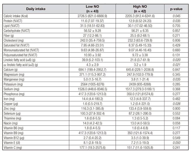 Daily intake of total calories, alpha-linolenic fatty acid (ω3) and linoleic acid (ω6) were different according to median of NO concentration (Table II). In relation to micronutrients, a higher consumption of manganese, copper, zinc, selenium, vitamin B12 and Vitamin C was observed as well as a statistical tendency for lower consumption of vitamin E and niacin in those individuals with high NO.