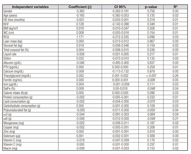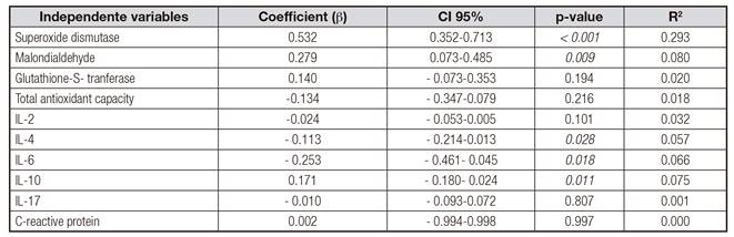 In addition, the possible contribution of clinical and anthropometric variables, as well as metabolic, inflammatory and oxidative stress markers, and dietary intake to the NO variation in HD individuals were evaluated through bivariate regression analysis. Thus, IL-6, SOD, triacylglycerols, iron, transferrin saturation, ferritin and ingestion of ω6 were significantly association with NO concentration (Table III). In relation to inflammatory and oxidative stress markers, MDA, SOD, GST and IL-10 were positively associated, whereas IL-2, IL-4 and IL-6 formed negative predictors of NO (Table IV).