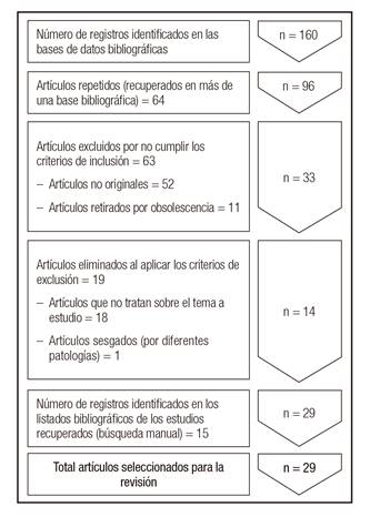 Con los criterios de búsqueda descritos se recuperaron 160 referencias de las que, tras eliminar los artículos duplicados y aplicar los criterios de inclusión y exclusión (Fig. 1), fue posible recuperar a texto completo 29 artículos 3) (11) (12) (13) (14) (15) (16) (17) (18) (19) (20) (21) (22) (23) (24) (25) (26) (27) (28) (29) (30) (31) (32) (33) (34) (35) (36) (37) (38 (Tabla I), procedentes de Medline (n = 4; 14%), Scopus (n = 9; 31%), ISI - Web of Science (n = 1; 3%) y los listados bibliográficos de los artículos relevantes recuperados (n = 15; 52%). El acuerdo sobre la pertinencia de los estudios seleccionados fue del 100%. Al evaluar la calidad de los artículos aceptados para la revisión mediante el cuestionario STROBE 10, las puntuaciones oscilaban entre 6,5 y 15,1, con mediana igual a 11,6 (Tabla II).