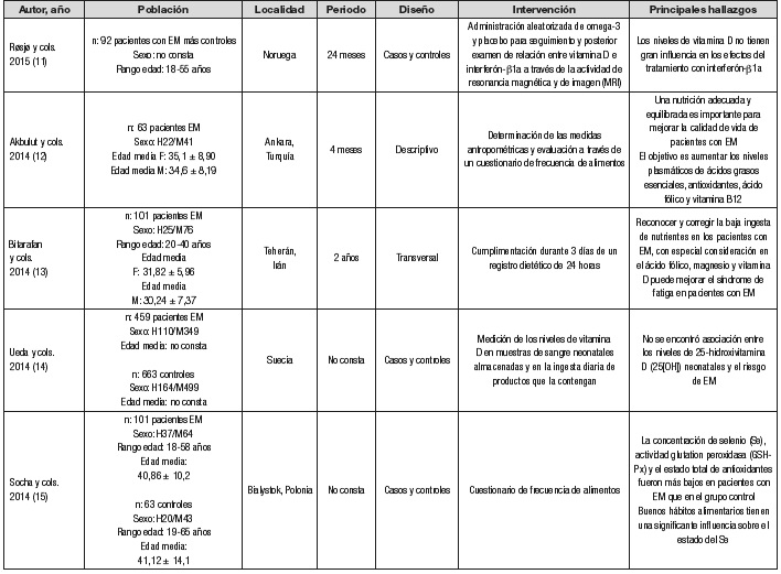 Método: revisión sistemática de la literatura científica recogida en las bases de datos Medline (PubMed), Scopus, Cochrane Library y Web of Science, hasta noviembre de 2016. Ecuación de búsqueda: ("Multiple Sclerosis"[Mesh] OR "Multiple Sclerosis"[Title/Abstract] OR "Disseminated Sclerosis"[Title/Abstract] OR "Multiple Sclerosis Acute Fulminating"[Title/Abstract]) AND ("Nutritional Status"[Mesh] OR "Nutritional Status"[Title/Abstract] OR "Nutrition Status"[Title/Abstract]). La calidad de los artículos se evaluó mediante el cuestionario STROBE. Se completó la búsqueda con la consulta a expertos y la revisión de la bibliografía de los artículos seleccionados.