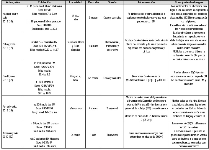 Resultado: de las 160 referencias recuperadas, tras aplicar los criterios de inclusión y exclusión, se seleccionaron para la revisión 29 artículos. La gran mayoría de los estudios determinaron los niveles de vitamina D. Otros centraron su búsqueda en averiguar qué déficits de nutrientes podrían estar relacionados con el desarrollo de la esclerosis múltiple.