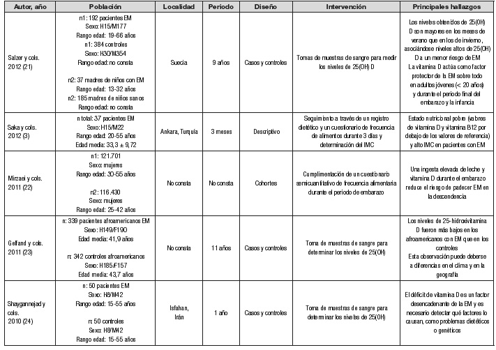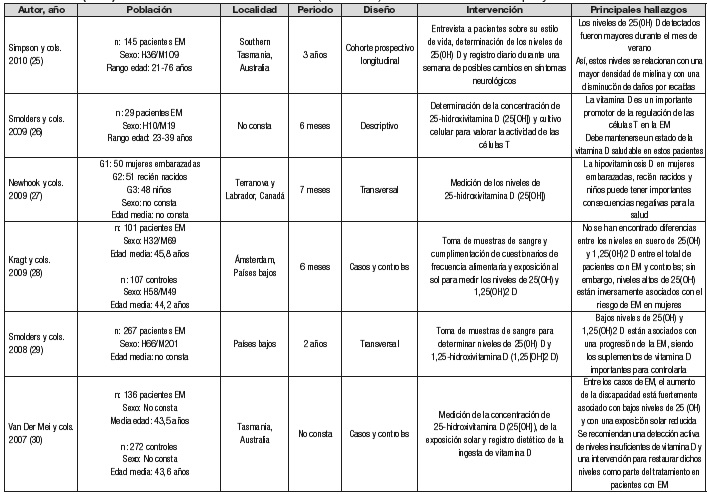 Por el contrario, Rosjo y cols. 11 y Ueda y cols. 14 difieren de las conclusiones anteriores, sin observar relación causal directa entre bajos niveles de vitamina D y la aparición de la EM. Así, Zabay y cols. 17 señalan que existen múltiples factores que contribuyen a la aparición de EM y el déficit de 25(OH) podría deberse a la disminución de la exposición solar, a la desnutrición o a dificultades de la ingesta, y no como causa de la EM. En esta línea, Munger y cols. 32 no encontraron asociación entre la EM y los niveles de 25(OH).