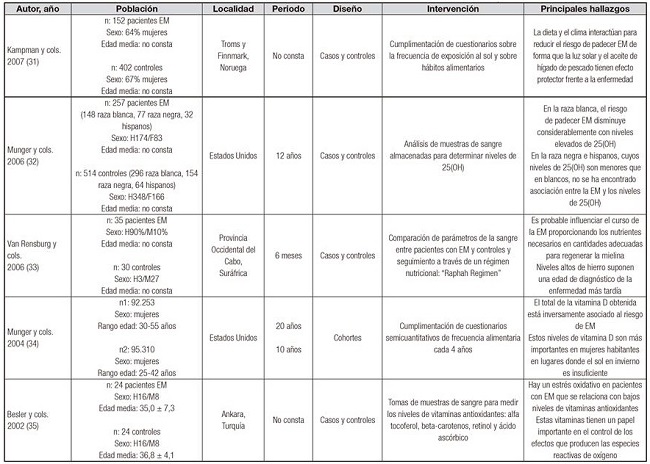 Kampman y cols. 31 destacan la importancia de la interacción entre la dieta y el clima para reducir el riesgo de padecer EM, de forma que la luz solar y el aceite de hígado de pescado tienen un efecto protector frente a la enfermedad.