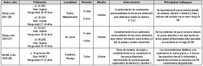 Besler y cols. 35 hablan de un estrés oxidativo en pacientes con EM que se relaciona con bajos niveles de vitaminas antioxidantes. Estos resultados son respaldados por otros dos estudios 12) (15 que destacan la importancia de niveles adecuados de antioxidantes. Por el contrario, Zhang y cols. 36 no encuentran relación entre el consumo elevado de carotenos, vitamina C, vitamina E, frutas y verduras y el desarrollo de la enfermedad. Entre otros resultados, destacan niveles adecuados de selenio 15, hierro 33, ácido fólico 12 y vitamina B12 3) (12 para un buen curso de la enfermedad.