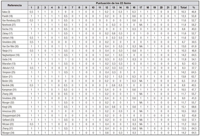 Para valorar la calidad de los artículos seleccionados se utilizaron las directrices para la publicación de estudios observacionales STROBE (Strengthening the Reporting of Observational studies in Epidemiology) 10, que contiene un listado de 22 variables que deben describirse en la publicación de estos estudios. Para cada artículo seleccionado se asignó un punto por cada ítem presente (en caso de no ser aplicable, no puntuaba). Cuando un ítem estaba compuesto por varios puntos, estos se evaluaron de forma independiente, dándole el mismo valor a cada uno de ellos, y posteriormente se realizó un promedio (siendo este el resultado final de ese ítem), de tal forma que en ningún caso se pudiera superar la puntuación de un punto por ítem.