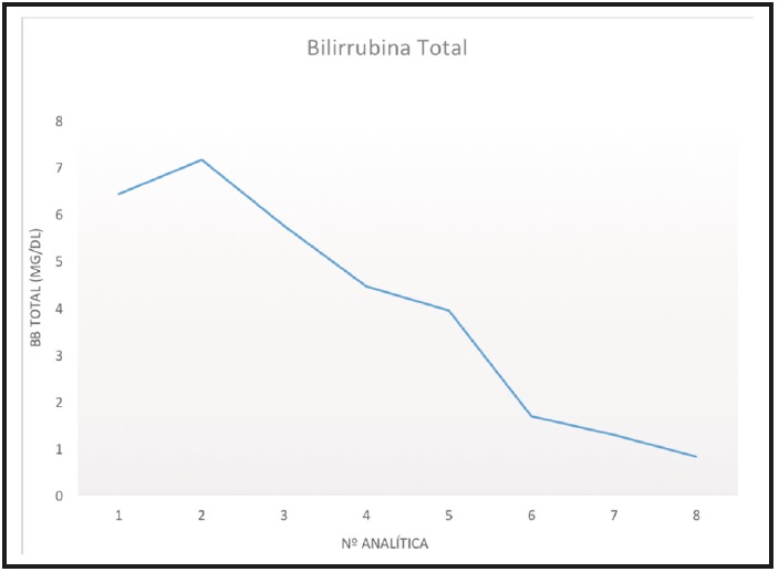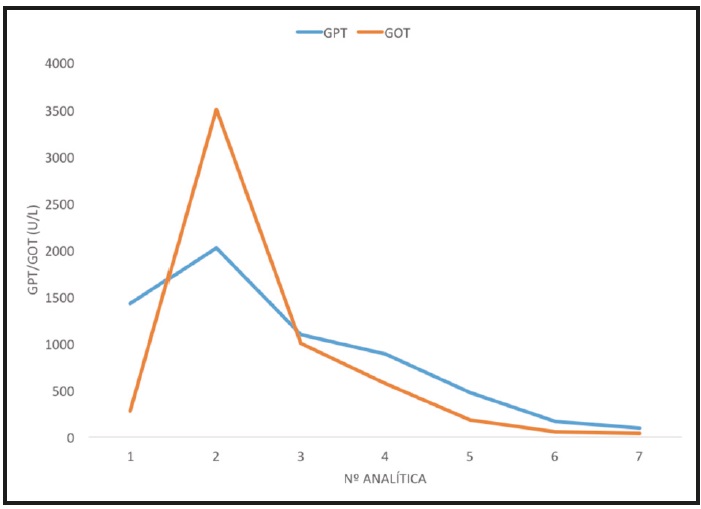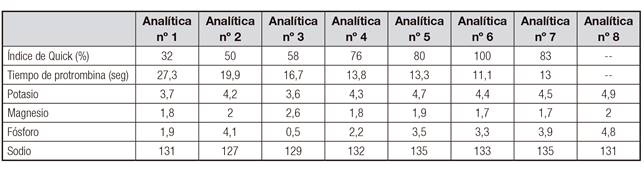 En la analítica inicial presenta GPT 1421 U/L y bilirrubina total 6,4 mg/dL, además de importantes alteraciones en la coagulación (Índice de Quick 32%, tiempo de protrombina 27,3 segundos) y síntomas de encefalopatía. Durante las siguientes 48 horas se produce un empeoramiento de función hepática hasta alcanzar valores de bilirrubina total 7,13 mg/dL, GPT 2012 U/L, objetivándose a su vez alteraciones iónicas (hiponatremia, hipopotasemia, hipomagnesemia e hipofosfatemia).