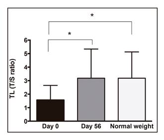 Results: we observed a significant increase on TL after supplementation (1.57 ± 1.1 to 3.2 ± 2.1 T/Sratio; p < 0.05). Moreover, we found shorter TL in obese patients (day 0) when compared to normal weight individuals (3.2 ± 1.9 T/Sratio; p < 0.05) and an inverse association between TL and BMI, even after age adjustment (beta = -0.527; r² = 0.286; IC = -0.129, -0.009).