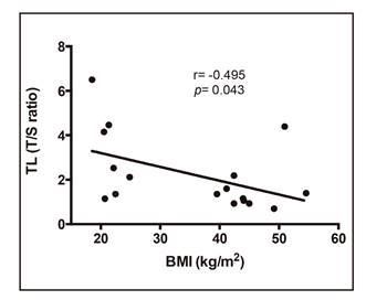 As shown in Figure 1, TL was markedly increased after green tea supplementation. Indeed, we found shorter TL in obese patients (day 0) when compared to normal weight individual. There was an inverse correlation between TL and BMI (Fig. 2); however, TL was not correlated with biochemical variables (data not shown). The linear regression analysis confirms the influence of BMI on TL, even after age adjustment (beta = -0.527; r² = 0.286; IC = -0.129, -0.009).