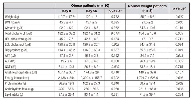 We conducted a cross-sectional interventional study in which ten obese (body mass index [BMI] > 40 kg/m²) and eight normal weight (BMI > 18.5 and < 24.9 kg/m²) women aged between 27 and 48 years were recruited. Patients were recruited from a previous study of our research group (data not published) that occurred between February 2015 and November 2015. Patients with alterations in liver biomarkers (glutamic oxaloacetic transaminase, glutamic pyruvic transaminase, gamma-glutamyl transpeptidase and alkaline phosphatase) were not included. Patients with a history of metabolic diseases such as diabetes, Cushing syndrome, hypo or hyperthyroidism and dyslipidemias, smokers and patients in use of medications such as antidepressants, antiobesity or hormone therapy, were excluded.