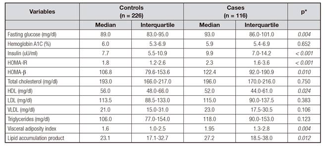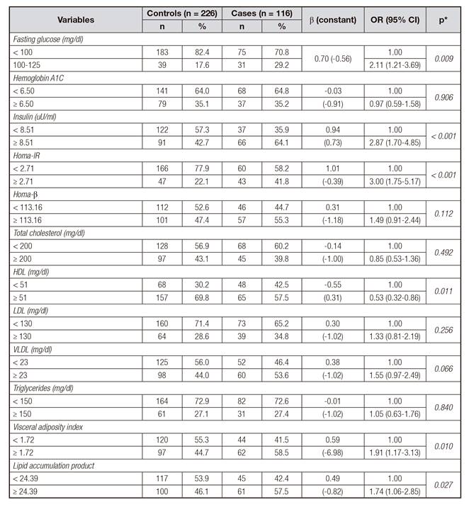 Methods: a hospital-based case control study was conducted with 116 women newly diagnosed with breast cancer and 226 controls. Body mass index, waist circumference, total cholesterol, high-density lipoproteins (HDL), low-density lipoproteins (LDL), very-low-density lipoproteins (VLDL), triglycerides, glycated hemoglobin, HOMA-IR, HOMA-β, lipid accumulation product (LAP), and visceral adiposity index (VAI) were assessed. Logistic regression was adjusted for body mass index and age to quantify the association between breast cancer risk and insulin resistance, dyslipidemias, and visceral adiposity.