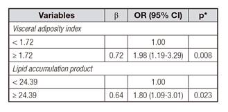 In order to ensure good reliability of the results obtained in the measurement of visceral adiposity, patients who had TG levels higher than 279 mg/dl, morbid obesity (BMI 39.99 kg/m²), and pendulous abdomen were excluded from these analyses 6. The VAI, LAP, and HOMA-β values were categorized according to the distribution of the total sample in less than or equal to the 50th percentile and above the 50th percentile. This distribution was adopted because there are no validated cut-off points for these indexes in a sample diagnosed with breast cancer.