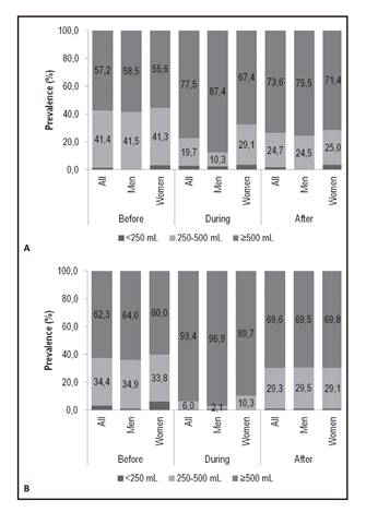 The overall amount of beverage intake before, during and after exercise on both training and competition days is shown in Figure 1. Overall, 1.4%, 41.4% and 57.2% of the subjects reported that they drank < 250, 250-500, and ≥ 500 ml, respectively, before exercise on training days, with no statistically significant differences between genders (p = 0.265). On competition days, 62.3% of subjects reported that they drank ≥ 500 ml before exercise. On the other hand, statistically significant differences in the distribution of the sample according to the amount of beverage intake during exercise were obtained on both training (p = 0.006) and competition (p = 0.042) days, with men more likely to drink ≥ 500 mlthan women were. After exercise, around 70% of the subjects reported that they drank ≥ 500 ml.