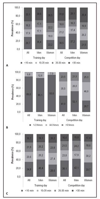 Figure 2 shows the time of fluid intake for those subjects who reported drinking some beverage before (A), during (B) and after (C) exercise on both training and competition days. Most of the subjects reported that they drank < 10 or > 30 minutes before exercise on both training and competition days. During exercise, most subjects (89.0%) reported that they drank 1-3 times on training days, while only 52.1% of men and 28.7% of women did so 1-3 times on competition days. Furthermore, 21.9% of men and 25.3% of women reported that they drank > 6 times during exercise on competition days. Overall, 80.3% and 83.4% of the subjects reported that they drank < 30 minutes after exercise on training and competition days, respectively.