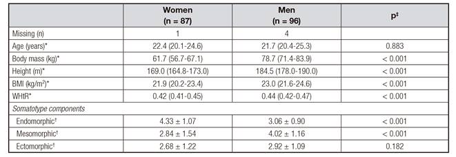 Analyses were performed with the Statistical Package for the Social Sciences version 24.0 (IBM SPSS Statistics for Windows, Armonk, NY: IBM Corp USA). All tests were stratified by gender. Categorical variables were presented as frequencies and/or proportions. Significant differences in prevalence were calculated by means of χ2 or Fisher's exact test. Normality of data was assessed using Kolmogorov-Smirnov test. Continuous variables were expressed as follows: mean (standard deviation [SD]) for normally distributed data (somatotype components: endomorphy, mesomorphy, ectomorphy), and median (1st-3rd quartile) for non-normally distributed data (age, weight, height, BMI, and WHtR). For normally distributed data, the unpaired Student's t-test was used to compare the mean of two independent groups. For non-normally distributed data, the Mann-Whitney U test was used to compare the median of two independent groups. The level of significance was established for p values at < 0.05.