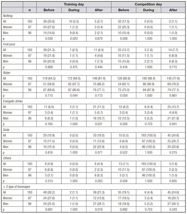 Water was the preferred beverage before, during, and after exercise on both training and competition days. In fact, 64.5% of the subjects reported that they drank water before exercise on training days, followed by fruit juice (21.3%), soda (10.9%), energy drinks (6.0%) and other beverages (4.9%). Overall, a quarter of the subjects reported more than one type of beverage before exercise on training days. On competition days, 68.9% of the subjects also reported that they drank water before exercise, followed by fruit juice (13.7%), energy drinks (8.2%), other beverages (7.1%) and soda (5.5%). However, men were more likely to show a preference for energy drinks than women. Almost all of the subjects reported that they only drank water during exercise on training days. However, all the subjects reported that they also drank soda and other beverages during exercise on competition days. Despite the fact that the preferred beverage after exercise on both training and competition days included water (81.4% and 77.6%, respectively), some subjects reported that they also drank soda (18.0% and 24.6%), energy drinks (11.5% and 13.7%), fruit juice (6.0% and 7.7%) and/or other beverages (4.4% and 1.6%). After exercise, men were also more likely to prefer energy drinks than women were.