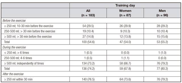 Good hydration habits were found in 54.6%, 74.2% and 76.5% of subjects before, during and after the training day, respectively. It is difficult to instil hydration habits into all sportsmen, and even more so in non-professional categories and in the lower divisions. Because good hydration substantially contributes to the improvement of physical performance, and drinking water ad lib is not enough, hydration patterns should be an important part of training 30. These results should be taken into account to establish recommendations by sports organizations in relation to the amount and quality of liquid to drink before, during and after exercise, taking into account the type of sport, duration and climate.