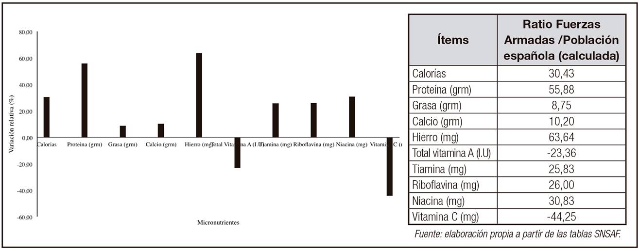 En cuanto a la composición analítica de las dietas, en la Figura 1 se compara el contenido en calorías y diversos nutrientes de la dieta de los soldados con la del conjunto de la población española (equiparada a un valor igual a 100). Esta figura pone de manifiesto que, con excepción de las vitaminas A y C (cuya ingesta media por parte de los soldados era inferior, en un 20% y un 40%, respectivamente, a la media española), en el resto de los indicadores el balance era favorable en la alimentación militar, sobre todo en lo referente a su aporte de proteínas y hierro, casi un 60% más elevado en la dieta de la población militar que en la media de la dieta de la población española.