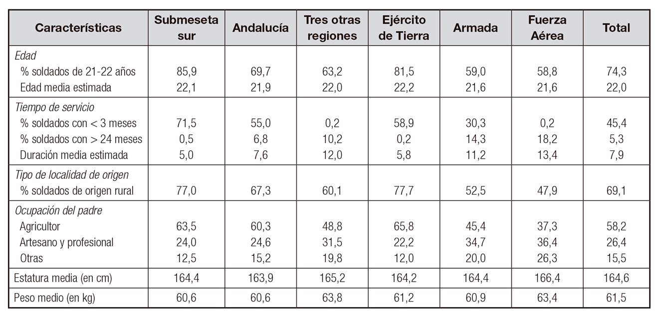 La Tabla II permite apreciar otras características de los soldados del SNSAF y, en primer lugar, su edad y el tiempo de servicio militar realizado. La edad media de los soldados de la muestra era de 22,0 años y su tiempo medio de servicio, de 7,9 meses. En la submeseta sur, la edad media era ligeramente más alta y menor el tiempo de servicio, debido a que en esta zona la proporción de soldados del Ejército de Tierra era mayor y a que en este Ejército la edad media de entrada en servicio era ligeramente mayor que en la Armada y en la Fuerza Aérea. Las dos siguientes variables, recogidas en la Tabla II, son la proporción de soldados procedentes de localidades rurales, sobre todo los de la muestra, y la distribución de estos últimos según la ocupación del padre. El origen rural se determinó en base al nivel de autoconsumo de la familia del soldado y cuando la proporción que este representaba era superior al 50% del consumo total. La proporción de soldados de la muestra para los que se determinó un origen rural fue del 69% y del 58% con padre agricultor. Estas proporciones eran significativamente más bajas en el Ejército del Aire y en la Armada, y dado que la presencia de estos dos Ejércitos era insignificante en la submeseta sur, en esta zona las proporciones de soldados de origen rural y con padre agricultor eran por ello las más altas.