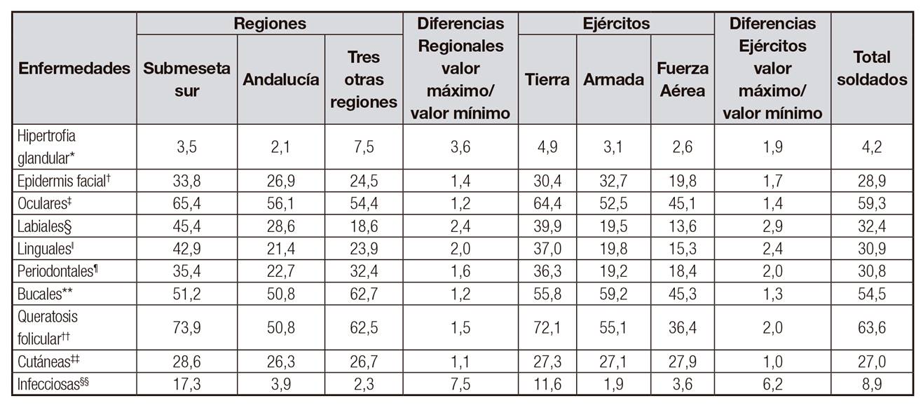 Las diferencias entre las otras dos regiones (Andalucía y las otras tres del norte y noreste) son pequeñas, excepto en el caso de la hipertrofia glandular, con una mayor prevalencia en el norte, y en particular en La Coruña. Las diferencias entre los otros dos Ejércitos son, en cambio, mayores, y en la Fuerza Aérea la prevalencia de todas las enfermedades, excepto de las infecciosas, es menor que en la Armada.
