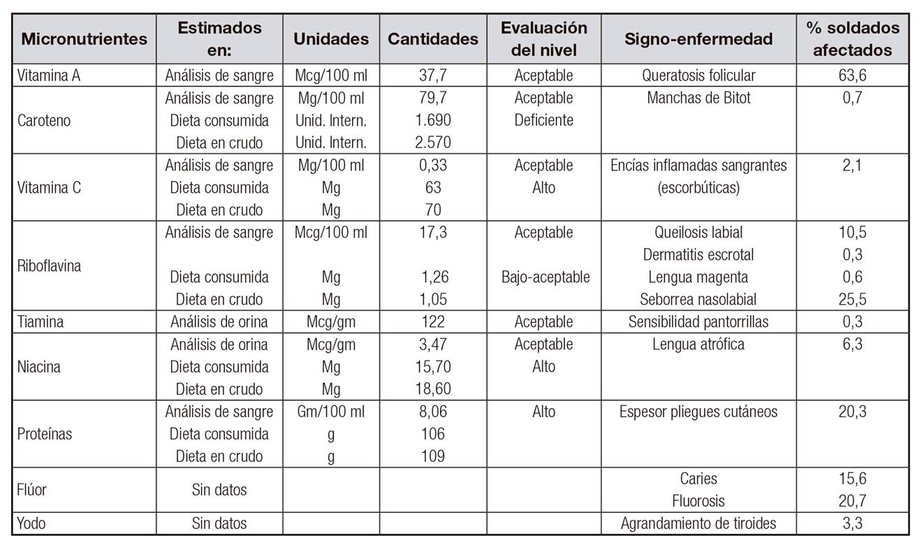 Results: the correspondence between the diagnosed diseases and the estimated micronutrient levels, both in the biochemical examination and in the analysis of diets, show that the military population examined was not affected by any serious deficiency condition. Except in vitamin A and riboflavin, in the other micronutrients no deficient levels were observed according to the ICNND standards.