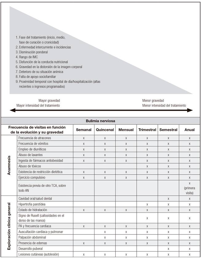 La gravedad mínima se basa en la frecuencia de comportamientos compensatorios inapropiados (véase a continuación). La gravedad puede aumentar para reflejar otros síntomas y el grado de discapacidad funcional.