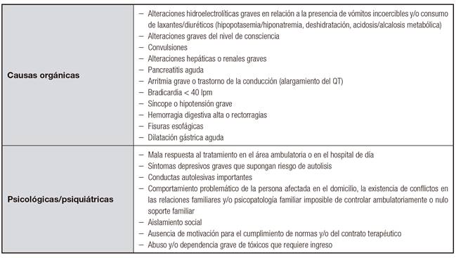 The management is carried out mainly at an outpatient level, being the day hospital useful in selected patients. Hospitalization should be reserved to correct serious somatic or psychiatric complications or as a measure to contain non-treatable conflict situations.