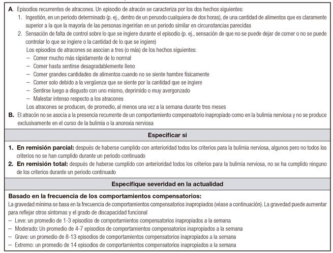 La gravedad mínima se basa en la frecuencia de los episodios de atracones (véase a continuación). La gravedad puede aumentar para reflejar otros síntomas y el grado de discapacidad funcional.